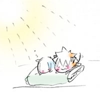 おてんとさま ままんのおふとんほしみてたらねむくなっちゃった… おてんとさまあびて、ふたりでうとうと… * * * あれ? 母さん、干したって言ってたけど、 なんかしっとりしてるような… (ごめんなさい、よだれたらしたの…!) 081217 横丁indexへ indexへ