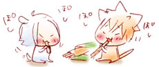 ぷりっつ 今日のおやつはぷりっつです! ぽしぽし、うまうま! あれ? さいごのいっぽんだ… どうしよう、じょうずにはんぶんこできるかな… ぼす、たべていいですよ! だめ、はんぶんこするの! そうだ! はじっこから、いっしょにたべればはんぶんこだよ! さすがです、ぼす! ! 君ら何してんのー!!//// 奴らは無自覚です。 091111 横丁indexへ indexへ