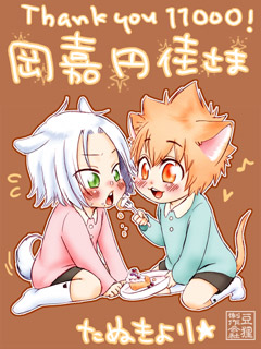11000hit/岡嘉円佳さま 『つにゃはちょ「たまには、はーちょのお世話するつにゃ」』とのリクエストでした。 大変お待たせしました! お世話、ということで、おやつをあーんしてもらいました。いかがでしょうか… でもお世話するのに慣れてないつにゃは、はちょの鼻についたクリーム拭こうとして、顔中に広げちゃいそうです… 文字なしver.とおまけちゃん。 ご依頼ありがとうございました! 090427/たぬきより 戻る indexへ