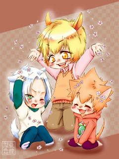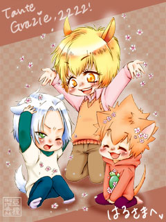 2222hit/はる様のご依頼 『でのが花を振りまきながら、楽しそうにつにゃとはーちょと遊んでる感じな絵』とのリクエストでした。 いかがでしょうか…!!!>◇<; なんか、アポロチョコみたいな色合いに……!! 文字なしver.とおまけちゃん。 ご依頼ありがとうございましたっ! 090118/たぬきより 戻る indexへ