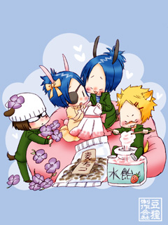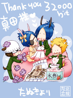 32000hit/真田 さま 『こくようの皆で、くろーむちゃんのことをチヤホヤする』とのリクエストでした。 お待たせしましたっ! お菓子とお花とお洋服、女の子の好きそうなもの集めてみたら、盛りすぎて、ちょっとちいさくなってしまいました…orz 文字なしver.とおまけちゃん。 ご依頼ありがとうございました! 090903/たぬきより 戻る indexへ