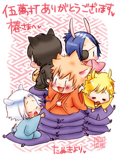 50000hit/椿さまのご依頼 やまだく〜ん、おざぶもっともってきてぇ〜! 『みんなで大喜利』とのリクエストでした。 大変!お待たせしました!!! 多分つにゃがチャッラーン☆のひとです。 みんなおきものだから、なんだかお正月みたいですね…orz 文字なしver.とおまけちゃん。 ご依頼ありがとうございました! 091225/たぬきより 戻る indexへ