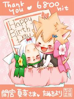 6800hit/間宮夏芽さま 『つにゃはちょでほのぼの+りぼん付き』とのリクエストでした。 大変お待たせしましたっ! お誕生日おめでとうございます〜^^* ちょっとこてこてしすぎましたかね……; 文字なしver.とおまけちゃん。 ご依頼ありがとうございましたっ! 090310/たぬきより 戻る indexへ