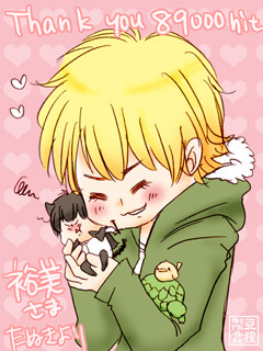 89000hit/裕美さまのご依頼 黒い猫、かっこいいな! 『ディーノ(人)がひばりさん(猫)を手のひらに乗せ、頬擦りしてる(ひばりさんは今にも咬み殺しそう)』 大変お待たせしました! 乗せるというか、ガッチリホールドしちゃってますね…(´ω`;) 文字なしver.とおまけちゃん。 ご依頼ありがとうございました〜! 110402/たぬきより 戻る indexへ