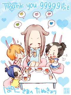 99999hit/ぱにさまのご依頼 お姉さんの恋バナに興味シンシン! 『ビアンキちゃんと3人のうさぎちゃん達とで恋ばなお食事会』 大変お待たせしました! みんなで、というよりはお姉さんの独壇場ですね…経験豊富そうv 文字なしver.とおまけちゃん。 ご依頼ありがとうございました〜! 110731/たぬきより 戻る indexへ